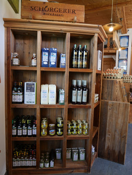 Frisches Sauerteig-Bauernbrot und je nach Saison, Tee, Tiroler Bienen-Honig, Marmelade, Müsli, Essig und Öl. Für besondere Anlässe werden zudem Geschenkkisten gefertigt oder ihr erwerbt Wertgutscheine.